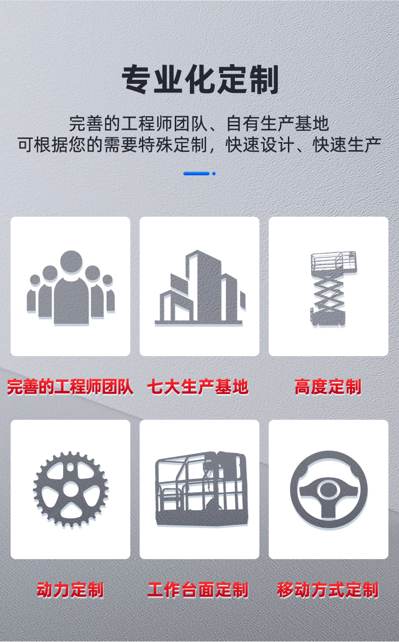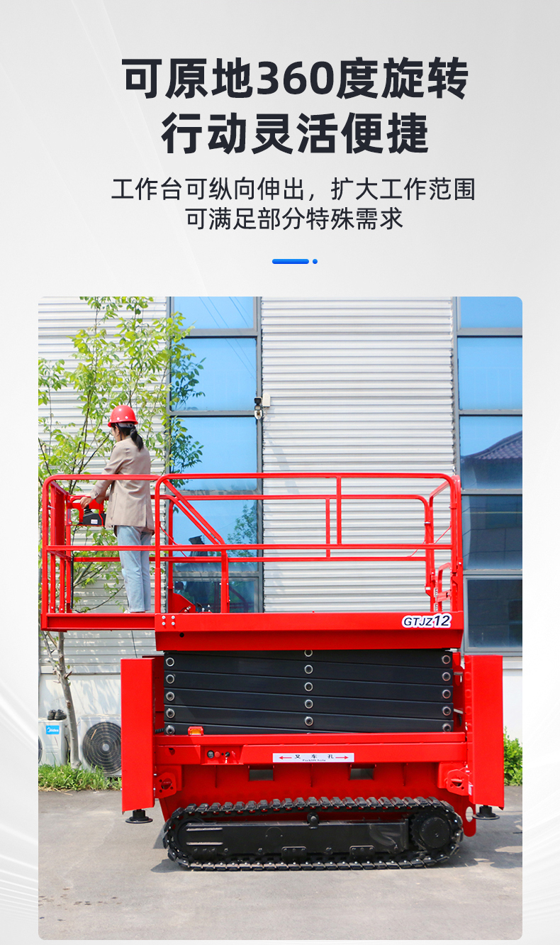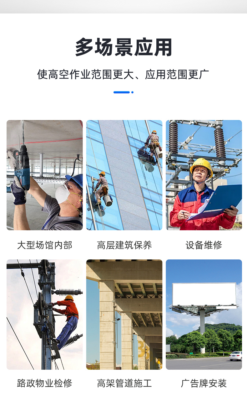 1.高效性:工作台面宽大,结构坚固,可多人同时工作,使高空作业更安全、效率更高。
