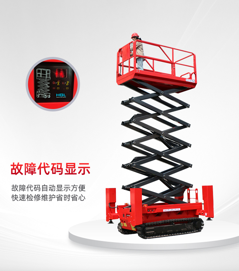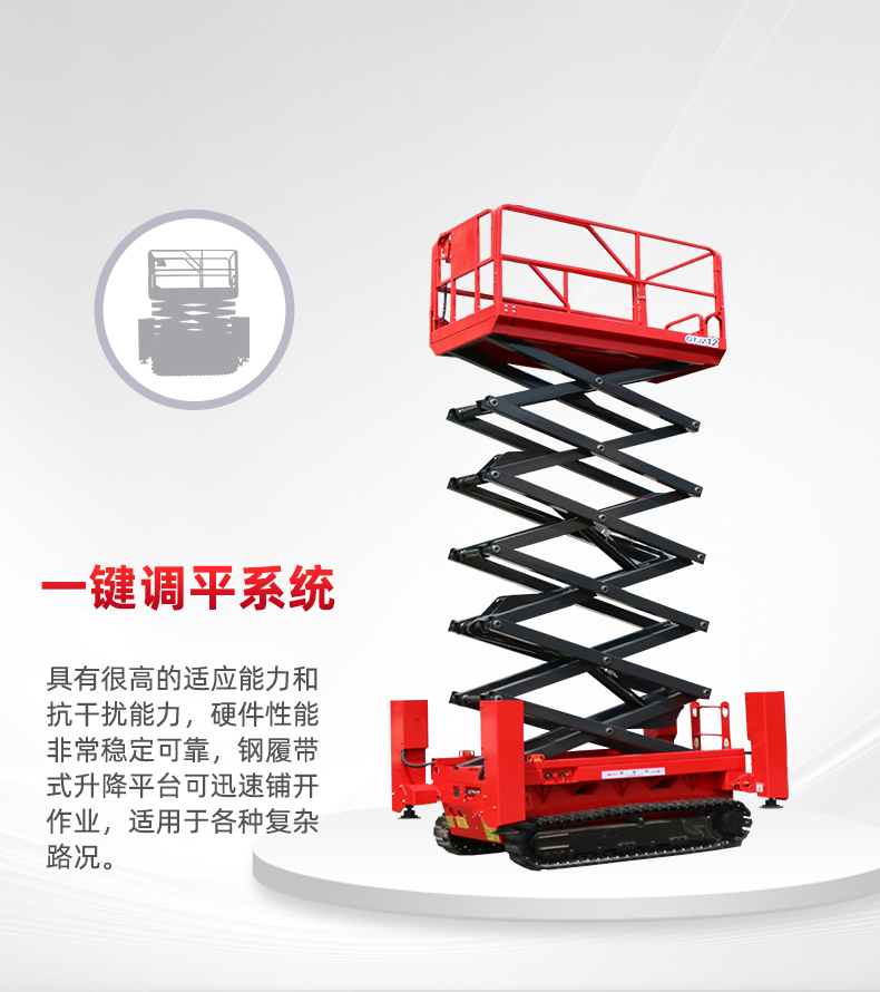 0531-84318288钢履带式升降机,是指采用钢制履带作为行走装置的升降机。这种设计使得升降机能够在各种复杂地形上稳定行驶,如不平坦地面、草地、泥泞地等,配备一键调平装置,具有很强的适应性和稳定性。