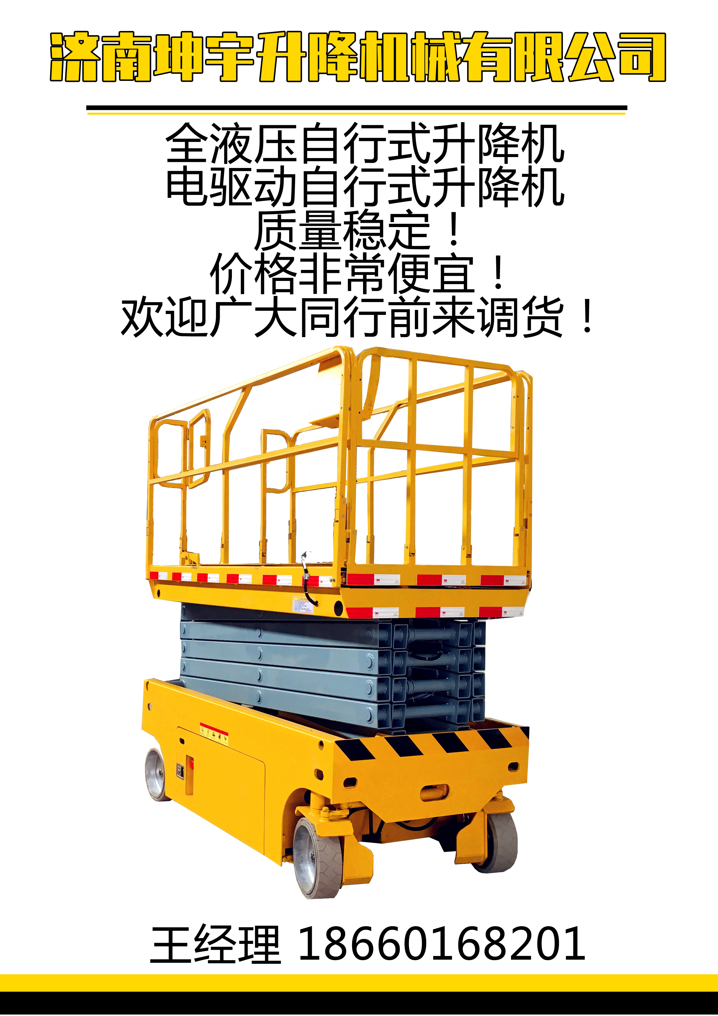 济南坤宇升降机械有限公司已经服务于超过一百多家贸易公司,提供产品,售后一条龙式服务。鑫坤宇自行式升降机产品升级,欢迎广大客户前来工厂实地考察。