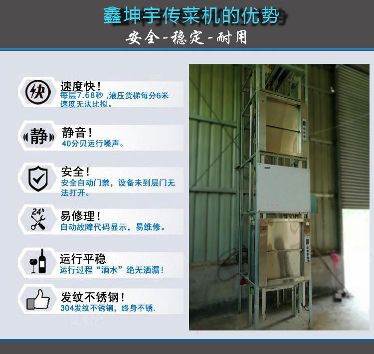 传菜电梯按性能分为落地式和窗口工作台式两种。使用餐车的客户一般选用落地式,这种样式运餐量大,多用于用餐集中的职工食堂,学生餐厅。工作台式操作灵活、取餐方便多用于酒店、宾馆、酒楼、咖啡厅,这种产品不但提高档次也提升了效率。